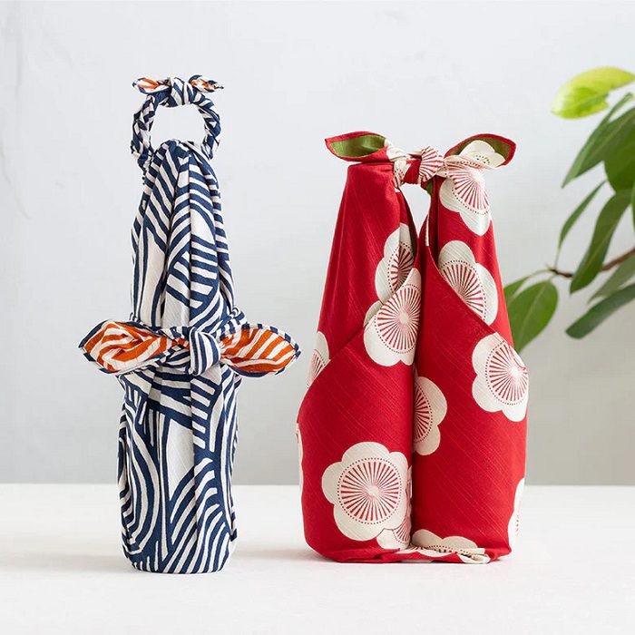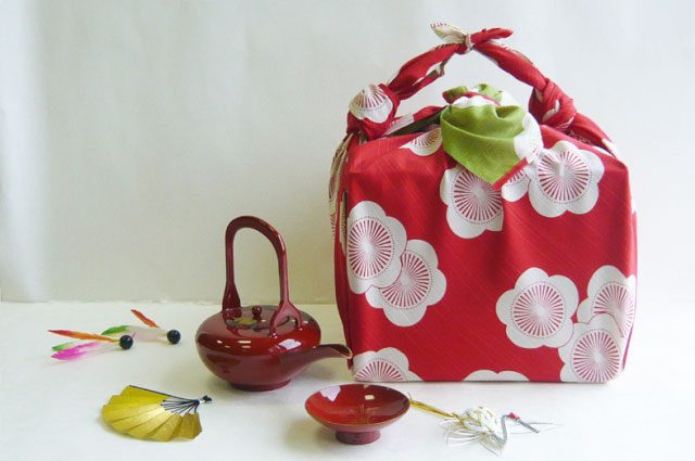 FUROSHIKI are square shaped cloths used in Japan to wrap items and carry them. Being made of cloth, FUROSHIKI can be stored easily, are very light and can wrap many different kinds of shapes. For those reasons, FUROSHIKI are convenient for day-to-day needs. They can be used to wrap several small goods together or wrap one bulky item, like a wine bottle or a large sake bottle. In addition to these advantages, FUROSHIKI can just be washed like other cloths when they get dirty. Japanese re-acknowledged that FUROSHIKI are also environmentally friendly, they became even more popular.