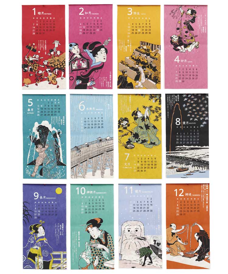 An eye-catching ukiyo-e calendar with vibrant colors.