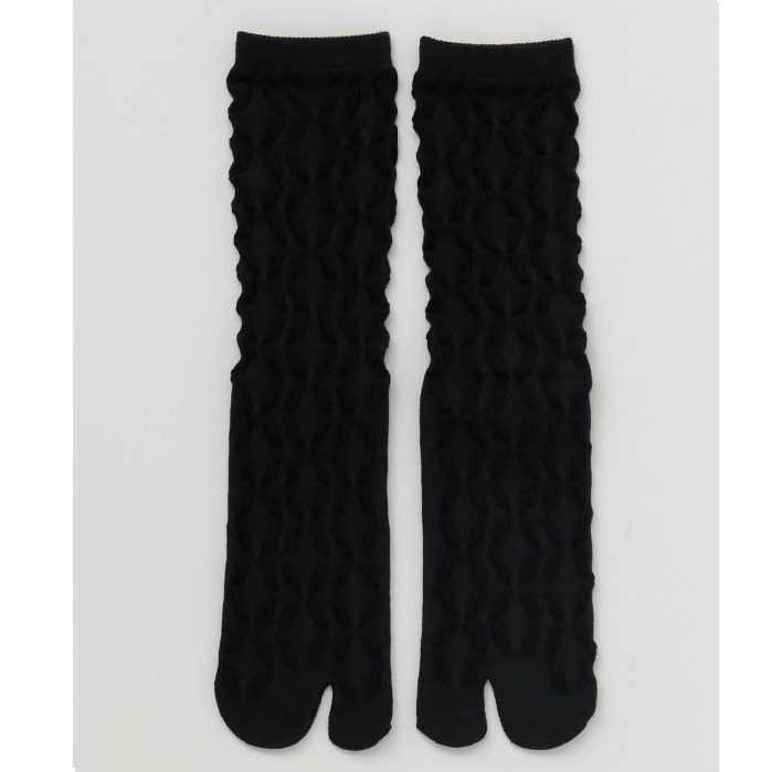 Tabi socks featuring a cloisonné pattern made with puffy, three-dimensional float knitting.