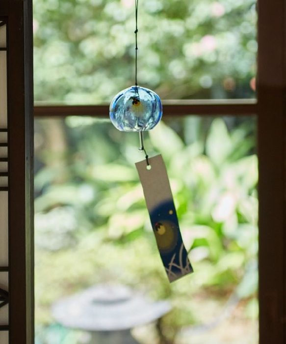 A fūrin (風鈴, ふうりん, lit. 'wind-bell') is a small, bowl-shaped Japanese wind chime typically hung during the summer. A piece of paper called tanzaku (短冊) is usually hung from each fūrin to cause it to ring even with just a slight breeze.